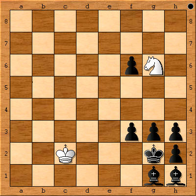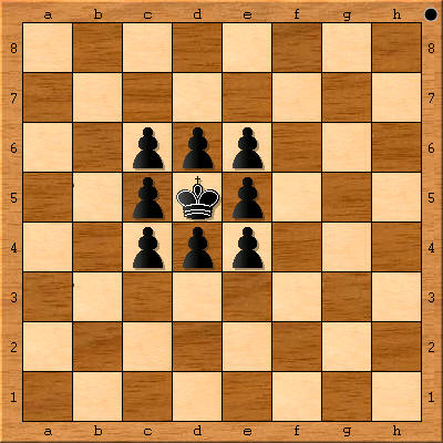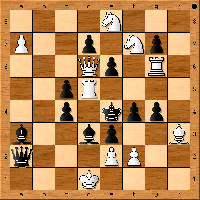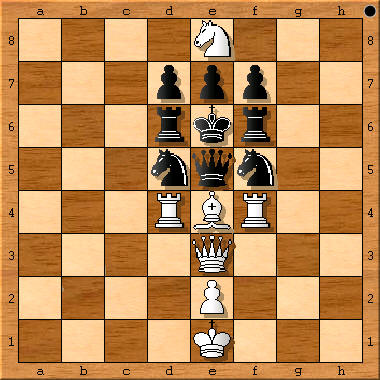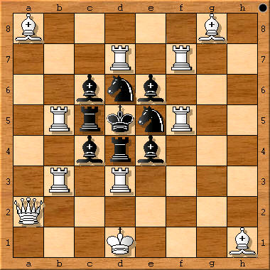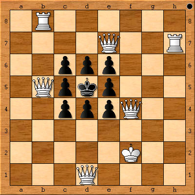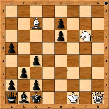 Nr. 5: Vom Autor gedacht war: 1.Sb1! (2.Sc3 matt ) d3 2.Sc3+ Kd4 3.Lf3! ef3: 4.Df2+ Kc3: 5.Db2 matt (Läuferopfer, Springeropfer, Opfer-Minimal!). Ein Matt in 4 Zügen war (von W. Speckmann) bereits erwähnt worden - hier sind ® Cook 1.Lh5(d1/h3) oder ® Cook 1.Dh6(e2/f2) möglich (h.e.). Der Computer enthüllt aber sogar ein Matt in 3 Zügen (!!): 1.Kb1?/Db2? bzw. 1.Lh5?/Le2? e3!; 1.Lf5? ef5:!; 1.Lf3? ef3:!; 1.Dg2? d3! Unbemerkt schlummerte aber über viele Jahre ... ® Cook 1.Dc2!! (2.Dc4: matt ) 1...e3(!) (1...c3 2.Db3(a2)+ c4 3.Dc4: matt c4 3.Dc4: matt ). 2.Lf3+ e4 3.De4: matt mit simpler - und sogar dualfreier! - Hauptvariante. Eine Warnung an Leichtgläubige: wenn es schon den Segen der Computerprüfung auf Korrektheit gibt, sollte man sie in der Neuzeit auch einsetzen ... Nr. 6: 1.ef3:+? Kf3:!; 1.ed3:+? Kd3:! 1.Ta1! (Asymmetrie) stellt nun den einzigen Wartezug gegenüber dem - völlig dualfreien - vollständigen Satzspiel dar: 1...ed2: 2.Kd2: fe2: 3.Th3 f3 4.Th4+ f4 5.Th5 e1- 6.Te1: matt (1...ef2: 2.Kf2: analog) entsprechend 1...de2: 2.Ta3 (ed2: 3.Kd2: usw.) 2...ef2: 3.Kf2: d3 4. Ta4+ (oder 2...d3 3.Ta4+ d4 4.Ta5 ed2:/ef2: 5.Kd2:/Kf2: [1...fe2: 2.Th3 analog]) ® mit Ta1 statt auf b1 zu Beginn (h.e.) und 1.Tb1! als Schlüssel ist zugleich das Homebase-Motiv erfüllt: exakt gleiche Lösungsvarianten und Verführungen, mit zusätzlichem optischen Probespiel 1.O-O-O? (ef2:/ed2:!). Nr. 7: Schwarz droht 1...e3+!; 1.Ddh1? ef4:! bzw. 1.Dfe3? d3! I) 1.Dc6:+! Kc6: 2.Db7 matt ; II) 1.Dc4:+! Kc4: 2.Db3 matt III) 1.Dc5:+! Kc5:(!) 2.De5: matt (Fesselung); IV) 1.Dd6:+! Kd6: 2.Td8 matt V) 1.De6:+! Ke6: 2.Df7 matt ; VI) 1.Dd4:+! Kd4:(!) 2.Dd2 matt VII) 1.De5:! Ke5:(!) 2.Dg5 matt ; VIII) 1.De4:+! Ke4: 2.Df3 matt Acht Damenopfer auf allen 8 Blockfeldern; die Annahme des Opfers ist stets dualfrei. Nr. 8: 1.f4? e5!; 1.bc4:+? bc4:!; 1.Sc7+? Kd6!; 1.Tg1? /Th2?/Tg3? e5!; 1.Db2? c3! 1.Tg6! b4 2.bc4: matt ; 1...cb3: 2.Db3: matt ; 1...c3 2.b4 matt ; 1...c5 2.Da8 matt ; 1...d2 2.Dd2: matt ; 1...d6 2.Sc7 matt , 1...ef3: 2.Lf3: matt ; 1...e3 2.f4 matt ; 1...e5 2.Td6 matt ; 1...f4 2.fe4: Analog zu A. C. White, 1906: ® Großer Diagonal-Kegel, Zugzwangschlüssel, 10 Varianten nach Zügen ® sämtlicher 8 Bauern. Läufer- und Damenfunktion teilweise vertauscht. Nr. 9: 1.Tfe7? (2.Le6: matt ) 1...Lg8: 2.Te5: matt ; 1...Lh1:!; 1.Lg2! 1...Ld7:/Lf5:/Lf7:/Lf3/Lg2:/Lb3:/Lb5:/Td3:/Tb5:/Lb7/La8:/ 2.Td7: matt /Tf5: matt /Lf7: matt /Lf3: matt /Dg2: matt /Db3: matt /Tb5: matt /Td3: matt /Tb5: matt /Lb7: matt /Da8: matt Nr. 10: 1.Tf2! (1.Td2? Da1+!) 1...Td~/Tf~ 2.Ld5: matt /Lf5: matt (Abzug, Fesselung) 1...Sd~/Sf~ 2.Se7 matt /Sg7 matt ; 1...Dd4:/Df4 2.Lf5: matt /Ld5: matt ; 1...De4: 2.De4: matt |