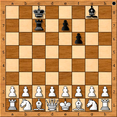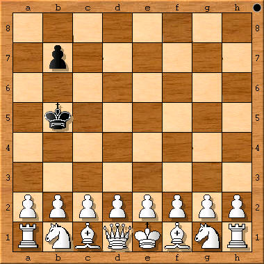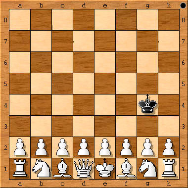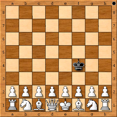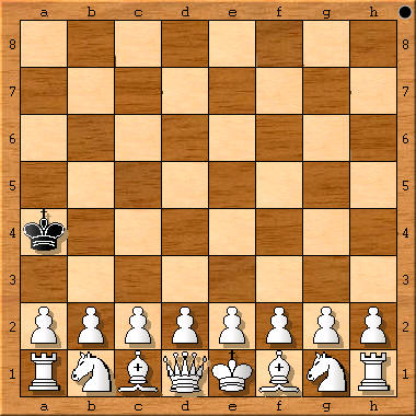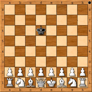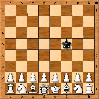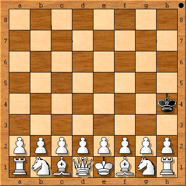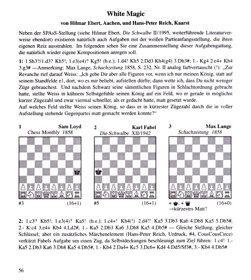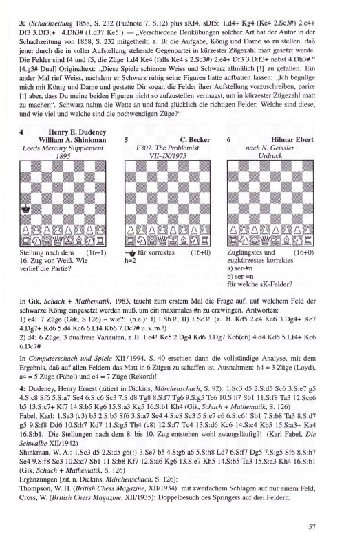 (Schachzeitung 1858, S. 232 (Fußnote 7, S.12) plus sKf4, sDf5: 1.d4+ Kg4 (Ke4 2.Sc3!) 2.e4+ Df3 3.Df3+ 4.Dh3# (1.d3? Ke5!)) „Verschiedene Denkübungen solcher Art hat der Autor in der Schachzeitung von 1858, S. 232 mitgeteilt, z. B.: Die Aufgabe, König und Dame so zu stellen, daß jener durch die in voller Aufstellung stehende Gegenpartei in kürzester Zugzahl matt gesetzt werde. Die Felder sind f4 und f5, die Züge 1.d4 Ke4 (falls Ke5 4.2.Sc3?) 2.e4+ Df3 3.Df3+ nebst 4.Dh3#.“ [4.3# Dual] Originaltext: „Diese Spiele scheinen Weiss und Schwarz allmählich (!) zu gefallen. Ein andermal rief Weiss, nachdem er Schwarz ruhig seine Figuren hatte aufbauen lassen: ‚Ich beginne mit König und Dame und gestatte Dir sogar, die Felder ihrer Aufstellung vorzuschreiben, parity (!) aber, dass Du meine beiden Figuren nicht so aufzustellen vermagst, um in kürzester Zugzahl matt zu machen.‘ Schwarz nahm die Wette an und fand glücklich die richtigen Felder. Welche sind diese, und wie viel Züge, welche sind die notwendigen Züge?“ In Gik, Schach + Mathematik, 1983, taucht zum ersten Mal die Frage auf, auf welchem Feld der schwarze König eingesetzt werden muß, um ein maximales #n zu erzwingen. Antworten: