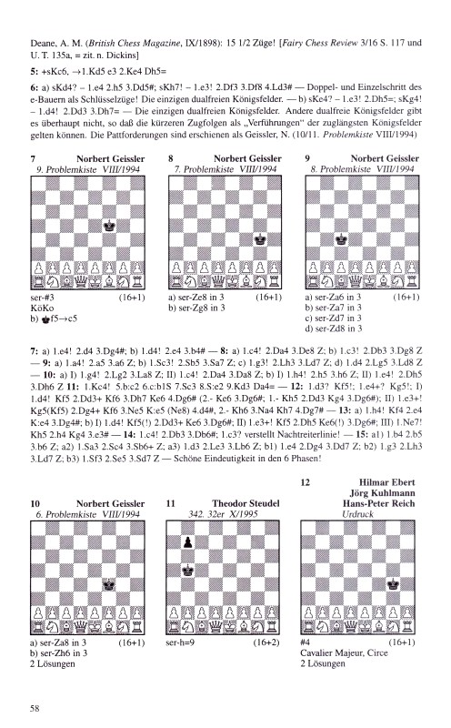 Ergänzungen [zit. in Dickins, Märchenschach, S.126]: - Thompson, W. H. (British Chess Magazine, XII/1934): mit zweifachem Schlagen auf nur einem Feld; - Cross, W. (British Chess Magazine, XII/1935): Doppelbesuch des Springers auf drei Feldern. - Deane, A. M. (British Chess Magazine, IX/1898): 15 1/2 Züge! (Fairy Chess Review 3/16 S.117 und U. T. 135a, = zit. n. Dickins) a) sKd4? – 1.e4 2.e5 3.Dd5#, sKh7! – 1.e3! 2.Df3 3.Df8 4.Ld4# – Doppel- und Einzelschritt des e-Bauern als Schlüsselzüge! Die einzigen dualfreien Königsfelder. b) sKe4? – 1.e3! 2.Dh5=, sKg4! – 1.d4! 2.Dd3 3.Dh7= – Die einzigen dualfreien Königsfelder. Andere dualfreie Königsfelder gibt es überhaupt nicht, so daß die kürzeren Zugfolgen als „Verführungen“ der zuglängsten Königsfelder gelten können. Die Partieforderungen sind erschienen als Geissler, N. (10/11, Problemkiste VIII/1994)