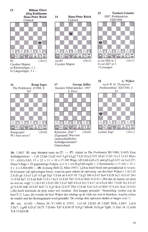 Lösung Het zet, März 1947. „Deze kluit bleek niet gemakkelijk te wezen. Er kwamen vijf oplossingen binnen, waarvan geen enkele de oplossing van den heer Wijker: („Dieser Brocken erwies sich als nicht leicht. Es gingen fünf Lösungen ein, von denen keine an die Lösung von Herrn Wijker heranreichte.“) 1.Sc3 d5 2.Sd5 g6 3.Se7 Ld7 4.Sg6? Dg5 5.Sb5 6.Sf7 b7 5…7.Sg5 6.S h7 Se4 9.S8 c6 7… b3! 2.Sc e6 11.S:b8 Ke7 12.S a6! Kd6 13.Se c7 Ke5 14.b5 5: Ta3 15.S a3 Kd4 16.S:b1 „Wit dus de laatste zet doen en wel als volgt:“ („Weiß muss also den letzten Zug machen, und zwar wie folgt:“) 1.Sc3 5 2.b5 5: 6.5 7… Sc3 5.S5 c7 6.c6 5: Sb1 7.5 b8 Ta3 8.S8 d7 5.98 Dd6 10…Sb7 Kd7 11.S5 9: S e6 12.S f7 13…S d6 14.c4 15…Ta3 16.e4 K b5 15…5 Sa3! Ka4 16.Sb1 „Hij heeft hiermee de prijs zeker wel verdiend. Een knappe prestatie! Vermelding verdient nog de heer F. C. Laas, die eveneens als heer Wijker slechts de stelling op de 16de zet te bereiken, waarbij echter de rondrit met het Koningspaard werd gemaakt. De overige drie oplossers deden er langer over.“ („Damit hat er den Preis auf jeden Fall verdient. Eine beeindruckende Leistung! Erwähnung verdient noch Herr F. C. Laas, der – ebenso wie Herr Wijker – die Stellung ebenfalls erst im 16. Zug erreichte, dabei aber den Rundlauf mit dem Königsspringer ausführte. Die übrigen drei Löser benötigten länger.“ )