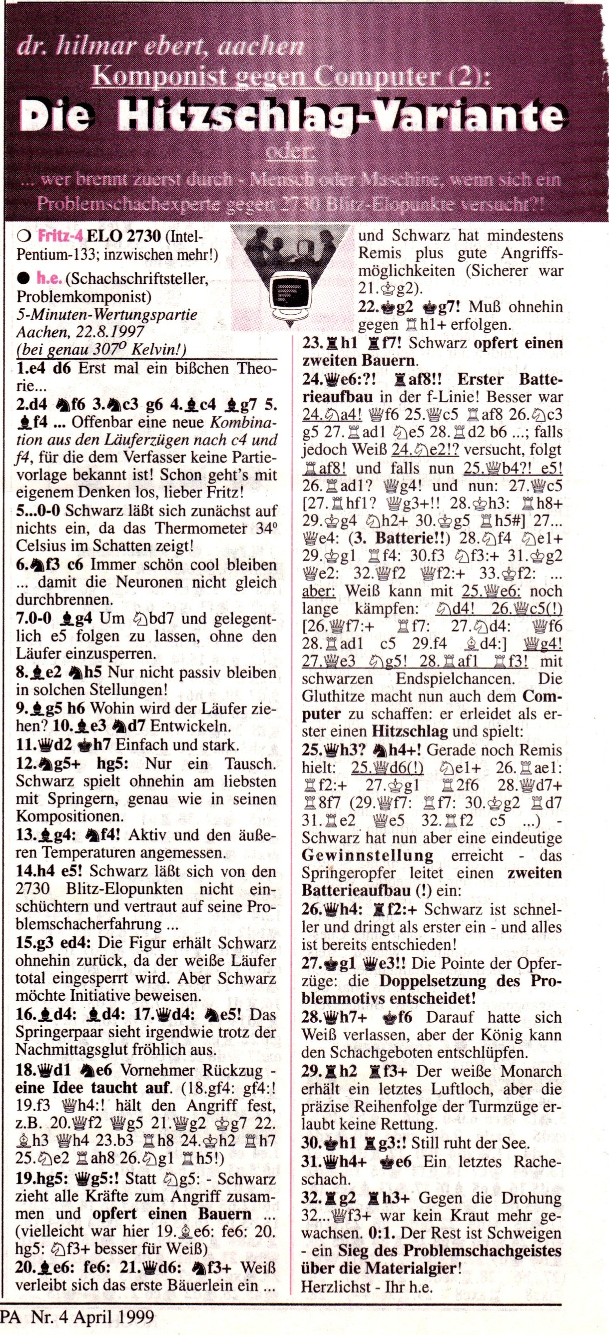Weiß: Fritz-4 ELO 2730 (Intel-Pentium-133; inzwischen mehr!) Schwarz: h.e. (Schachschriftsteller, Problemkomponist) 5-Minuten-Wertungspartie Aachen, 22.8.1997 (bei genau 307o Kelvin!)