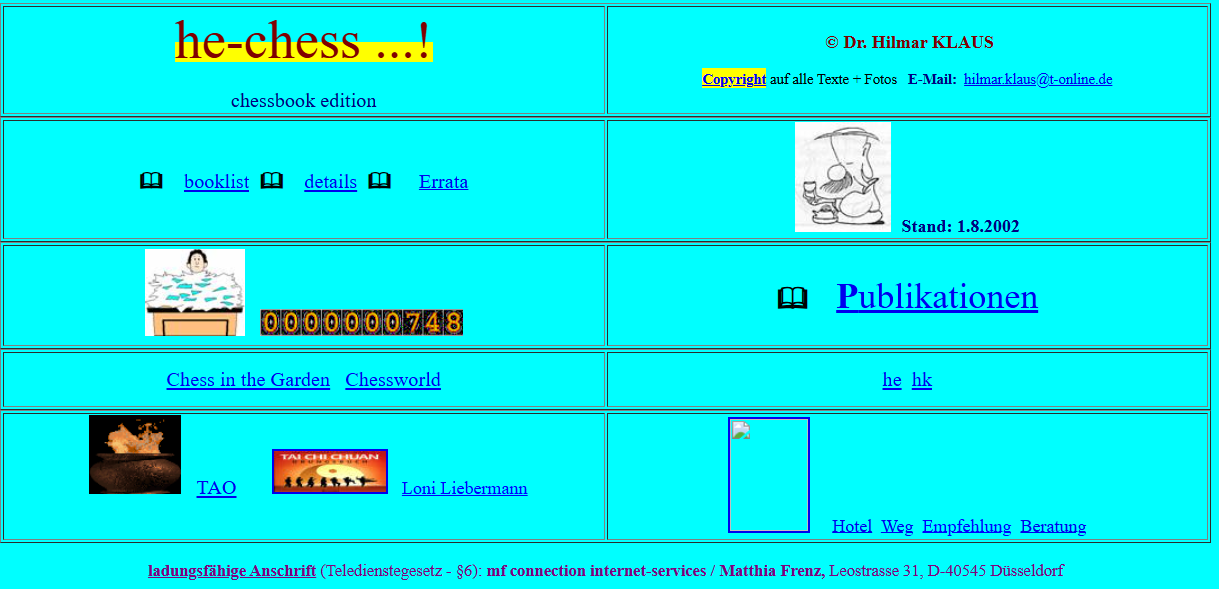 Liebe ist wie Schach: manchmal spielt man blind, manchmal simultan - und immer ist die Dame die stärkste Figur! http://people.freenet.de/AnnesHomepage/kinderaufsaetze02.html (22.) V 2002 ff. |