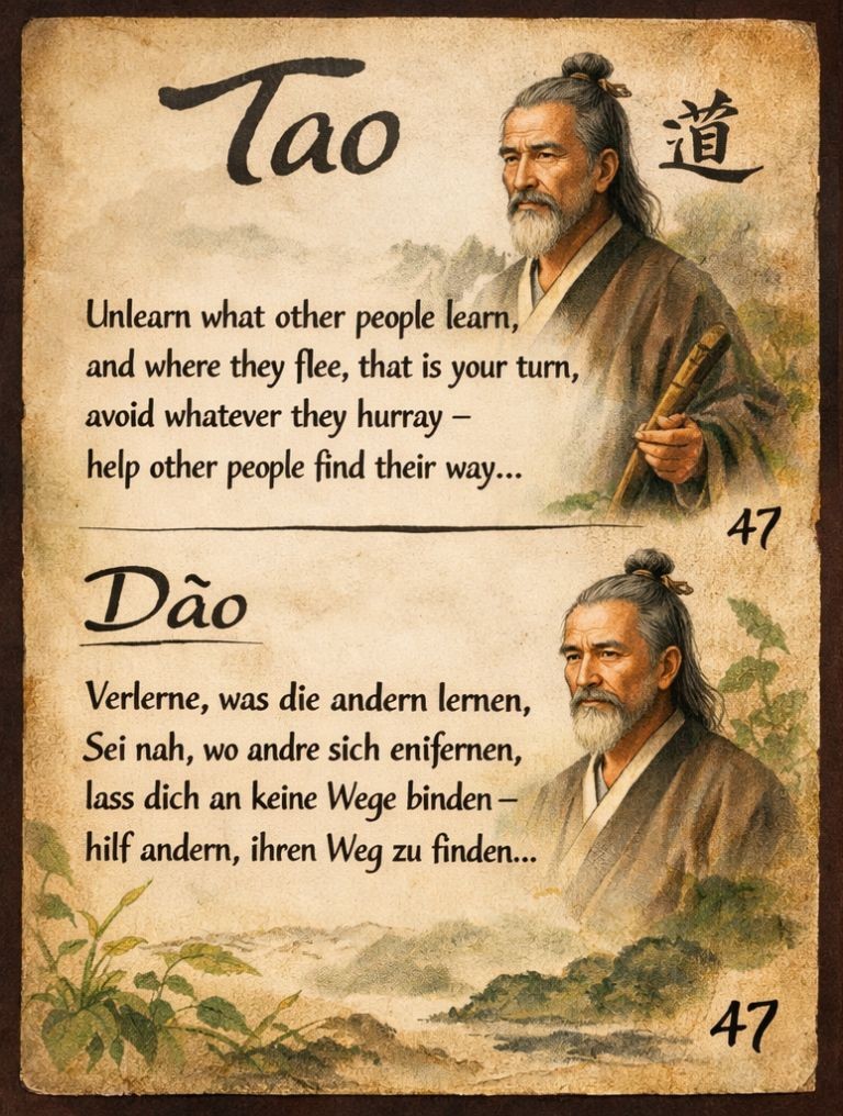 Ohne Müh', sagt Laozi, überleg' ... Lass nur die Natur Dein Lehrer sein: Ist in allen Wesen Mein und Dein – Einfach ist das Dào, ist der Weg