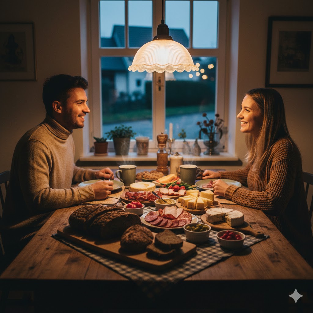 Abendbrot (n.) Deutsch: Eine traditionelle, meist kalte Mahlzeit am Abend, bei der Brot, Käse und Aufschnitt im Mittelpunkt stehen. Dieses Wort erhebt ein einfaches Grundnahrungsmittel zu einer sozialen Institution und einer festen Tageszeit. Es vermittelt ein Gefühl von Erdung und häuslicher Verlässlichkeit, das dem förmlicheren „Dinner“ oft fehlt.
