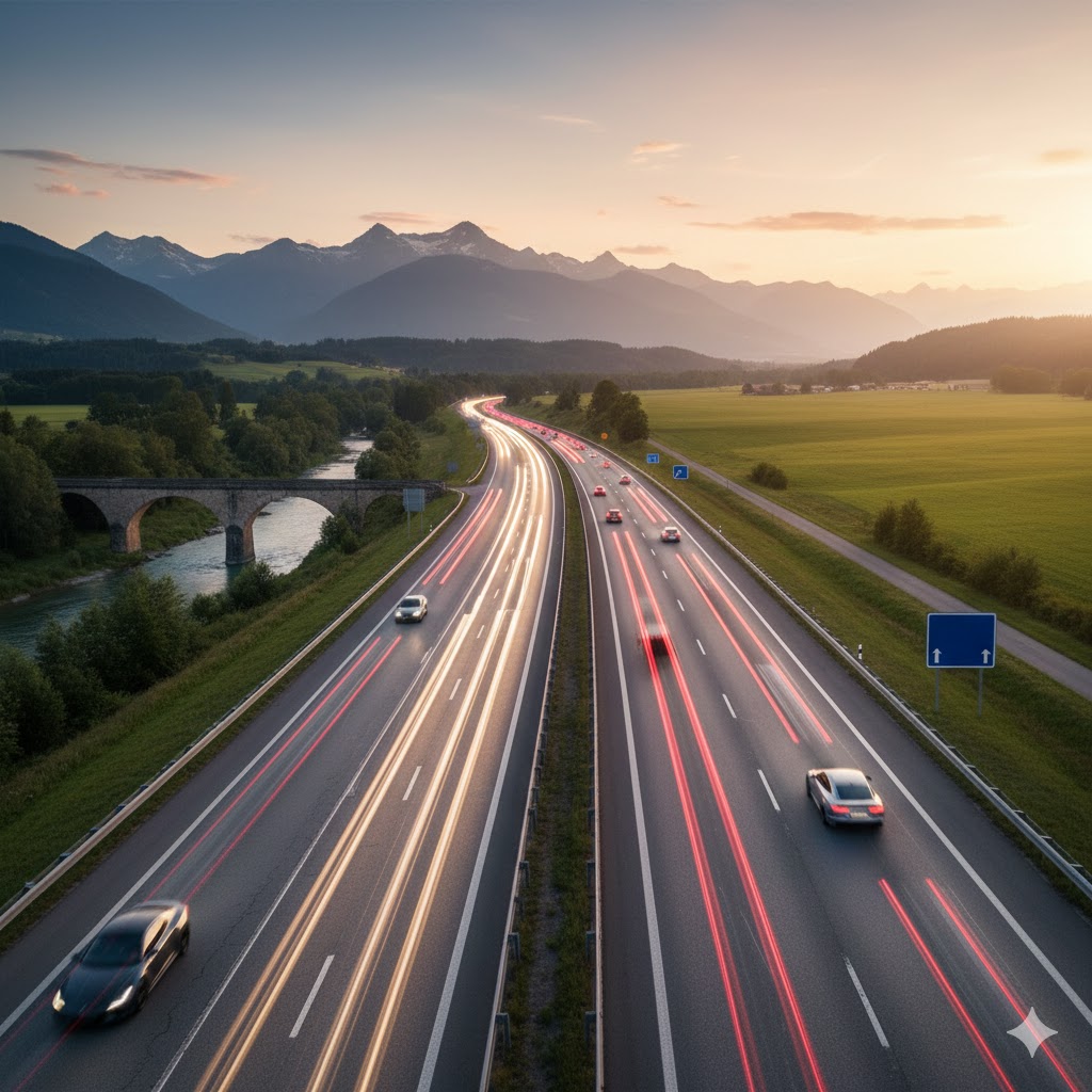Autobahn (f.) English: The German highway system, famous for the absence of a general speed limit. In English, the term is used almost exclusively to describe the specifically German experience of freedom and technical precision at high speeds. A “highway” is just a road; the “Autobahn” is a myth.