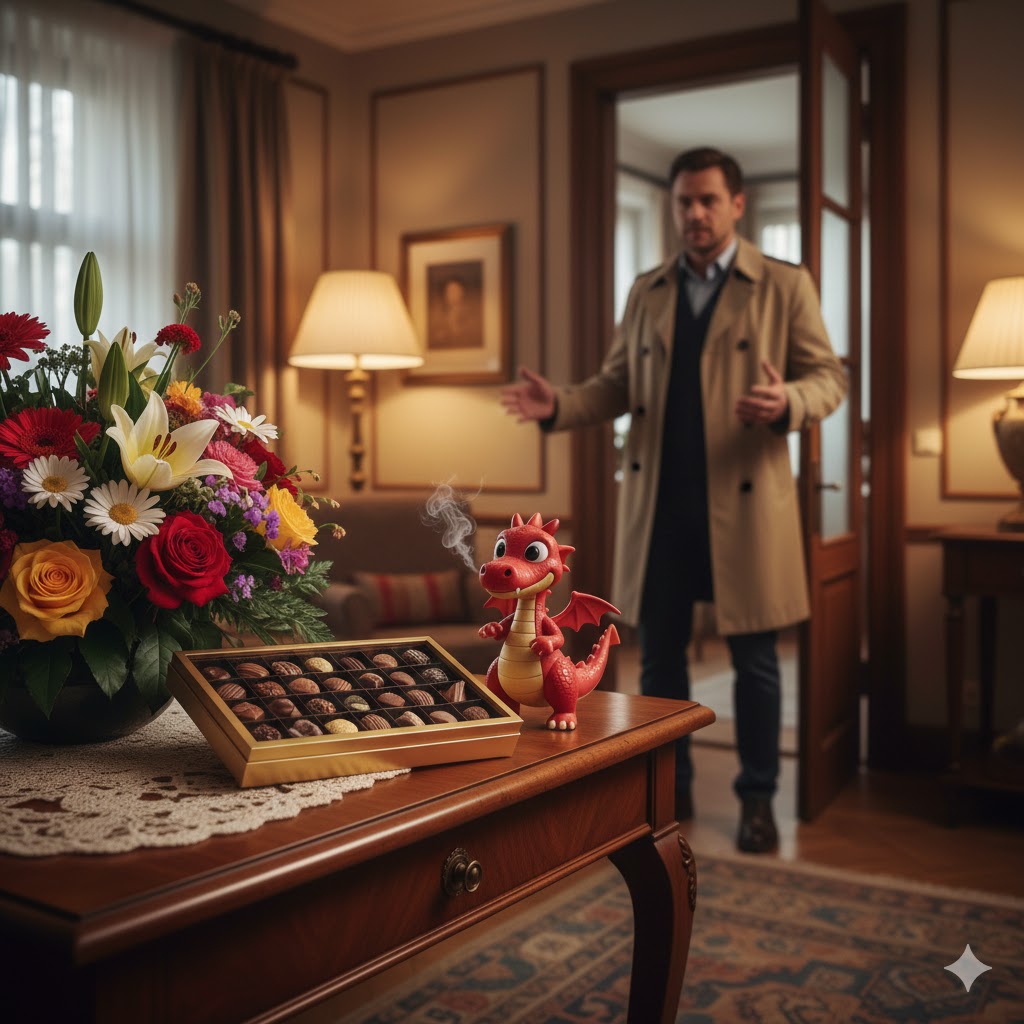 Drachenfutter (n.) Deutsch: Ein Versöhnungsgeschenk (Blumen, Pralinen), das man dem Partner mitbringt, wenn man etwas wiedergutzumachen hat. Der Begriff impliziert humorvoll, dass der Partner ein „Drache“ ist, den man besänftigen muss. Es fängt eine spezifische Mischung aus schlechtem Gewissen und häuslicher Diplomatie ein, für die das Englische keinen eigenen Begriff hat.