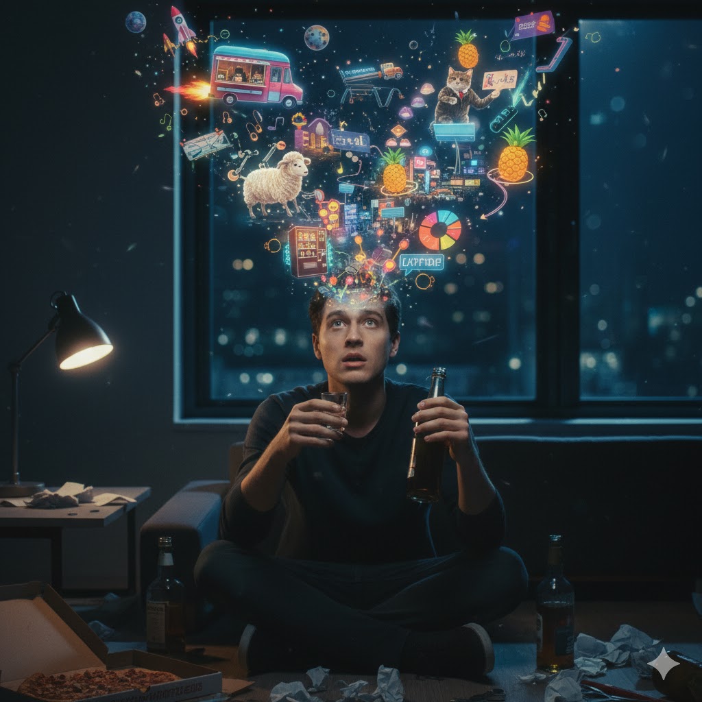 Schnapsidee (f.) English: A crazy, unrealistic, or foolish idea that seems as if it were conceived while intoxicated. Literally “schnapps idea.” It describes an idea that is usually regretted the next day. “Crazy idea” doesn't quite capture it, as a Schnapsidee often possesses its own flawed logic that only made sense in a moment of misguided enthusiasm.