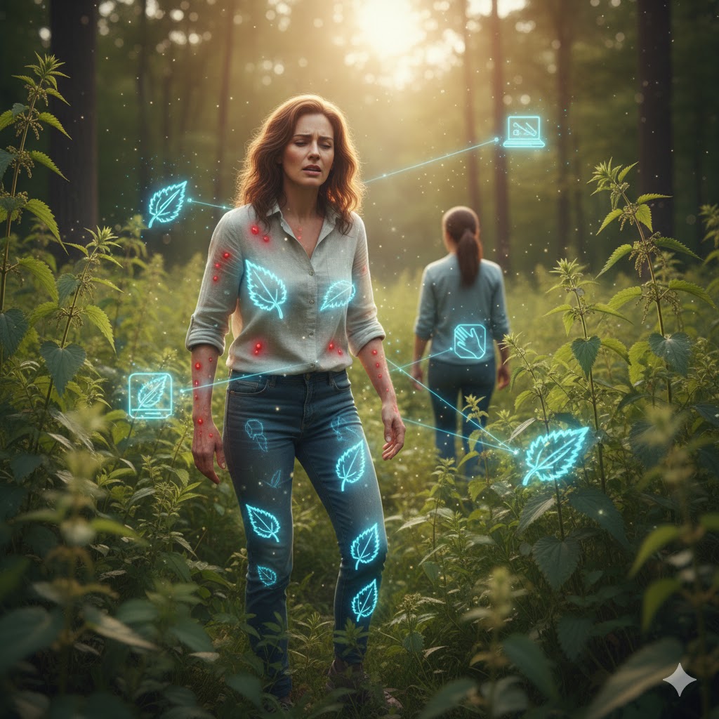 verbrennnesselt (adj. / Partizip) Deutsch: Das physische oder metaphorische Gefühl, mit einer Brennnessel in Kontakt gekommen zu sein; brennend und gereizt. Ein lautmalerisches Wort. Es beschreibt nicht nur den Hautreiz, sondern auch den emotionalen Zustand, wenn man von einer scharfen Bemerkung getroffen wurde. Im Englischen bleibt nur die umständliche Beschreibung.
