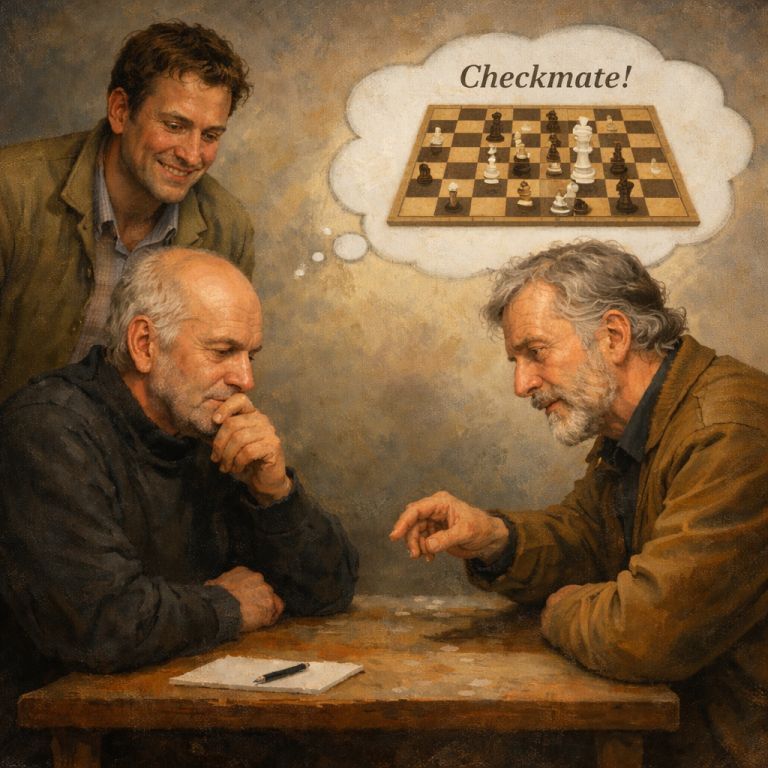 Der eine brummt, wie nebenbei Ganz langsam: "Tc6 – c2." Der andre wird allmählich wach Und knurrt: "Da3 – g3 Schach!"