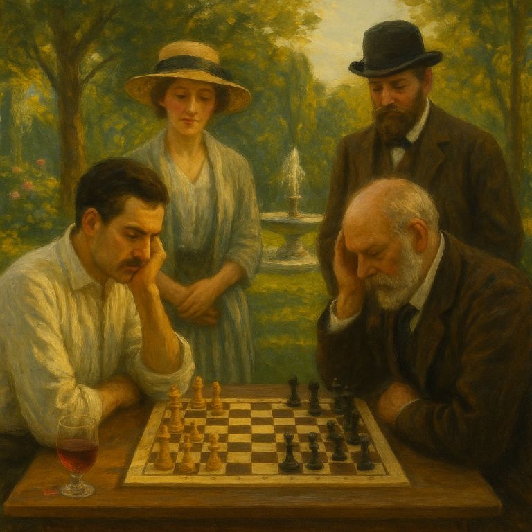 Schachspiel im Garten (After “ Miron.“), The British Chess Magazine VIII 1913, (translated by Hilmar Alquiros)*