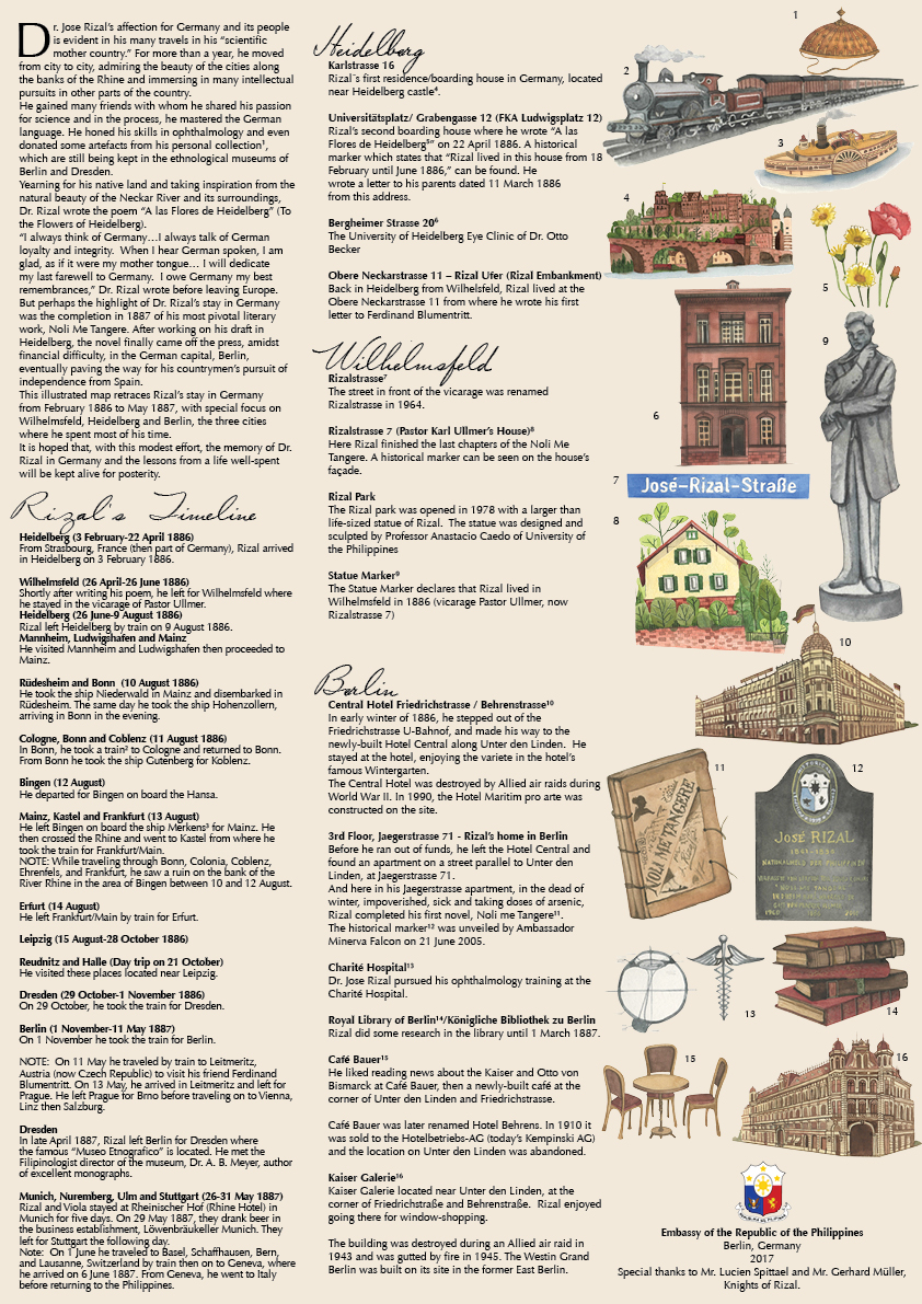Rizals spirituelle Aura ist in Heidelberg immer noch spürbar, verewigt durch sein nostalgisches Gedicht „A Las Flores de Heidelberg“, geschrieben am 22. April 1886. Dieses Gedicht reflektiert seine Sehnsucht nach Heimat und seine tiefe Verbindung zu dieser schönen Stadt. Jedes Jahr am 19. Juni strömen die Menschen aus Heidelberg und Wilhelmsfeld, angeführt vom örtlichen Kapitel der Knights of Rizal, den Rizalistas in Deutschland, Regierungsbeamten und der philippinischen Gemeinschaft, in diese malerische mittelalterliche Stadt, um José Rizals Geburtstag mit einer Kranzniederlegungszeremonie am Rizal-Denkmal zu feiern. Rizals Geburtstag ist eine jährliche Feier der dauerhaften Freundschaft zwischen Deutschland und den Philippinen.