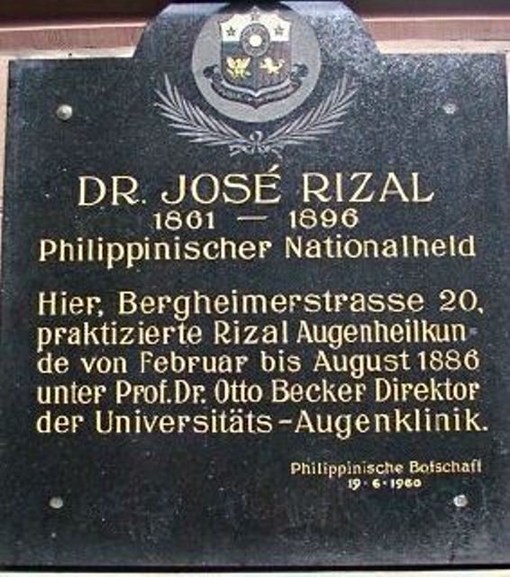 In der Bibliothek der Universität Heidelberg kann man die Universitäts-Augenklinik in der Bergheimer Str. 20 besuchen, wo Rizal Augenheilkunde praktizierte. Eine am Haupteingang angebrachte Bronzetafel erinnert an seine Zeit dort. Die deutsche Inschrift lautet: „Dr. José Rizal (1861-1896), Nationalheld der Philippinen: Hier, in der Bergheimer Str. 20, praktizierte Rizal von Februar bis August 1886 unter Professor Dr. Otto Becker, Direktor der Universitäts-Augenklinik, Augenheilkunde. Botschaft der Philippinen, 19. Juni 1960.“